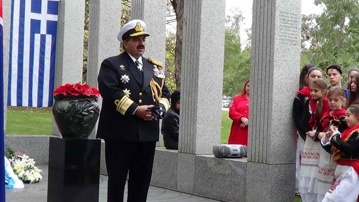 Τελετή στο Ελληνο-Αυστραλιανό μνημείο με τον Αντιναύαρχο Αλέξανδρο Θεοδοσίου ομιλούντα.